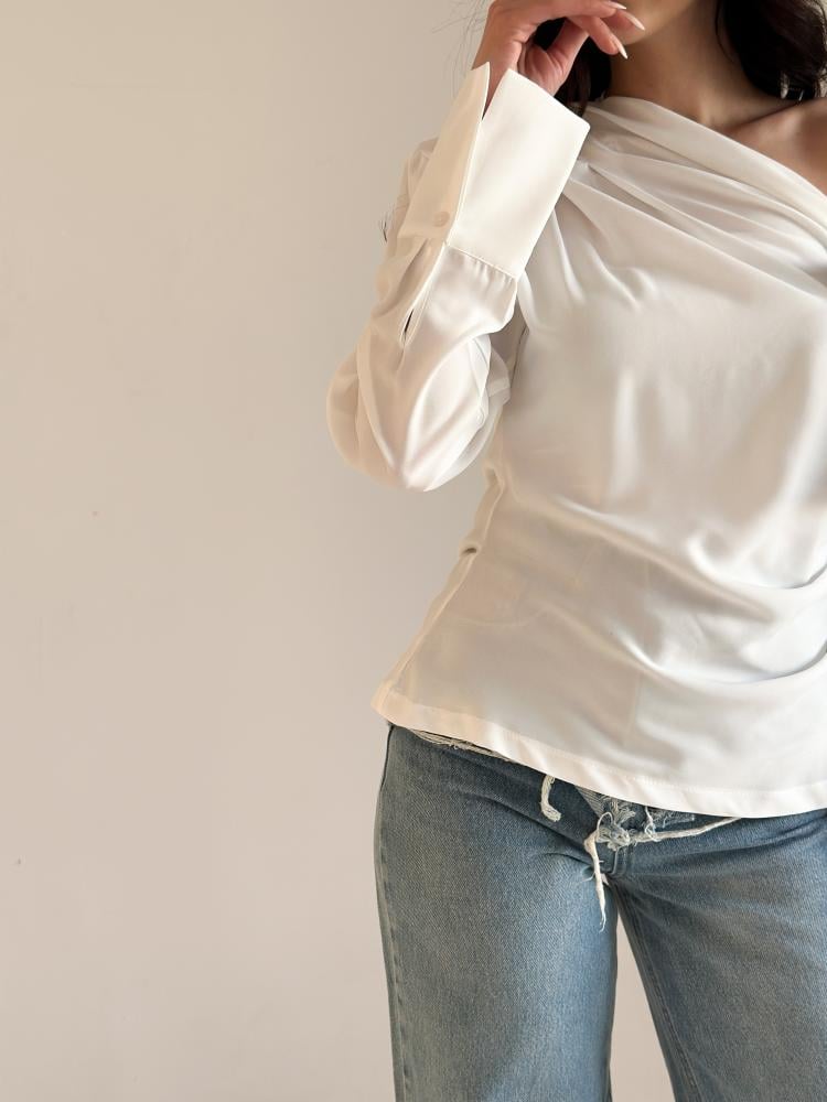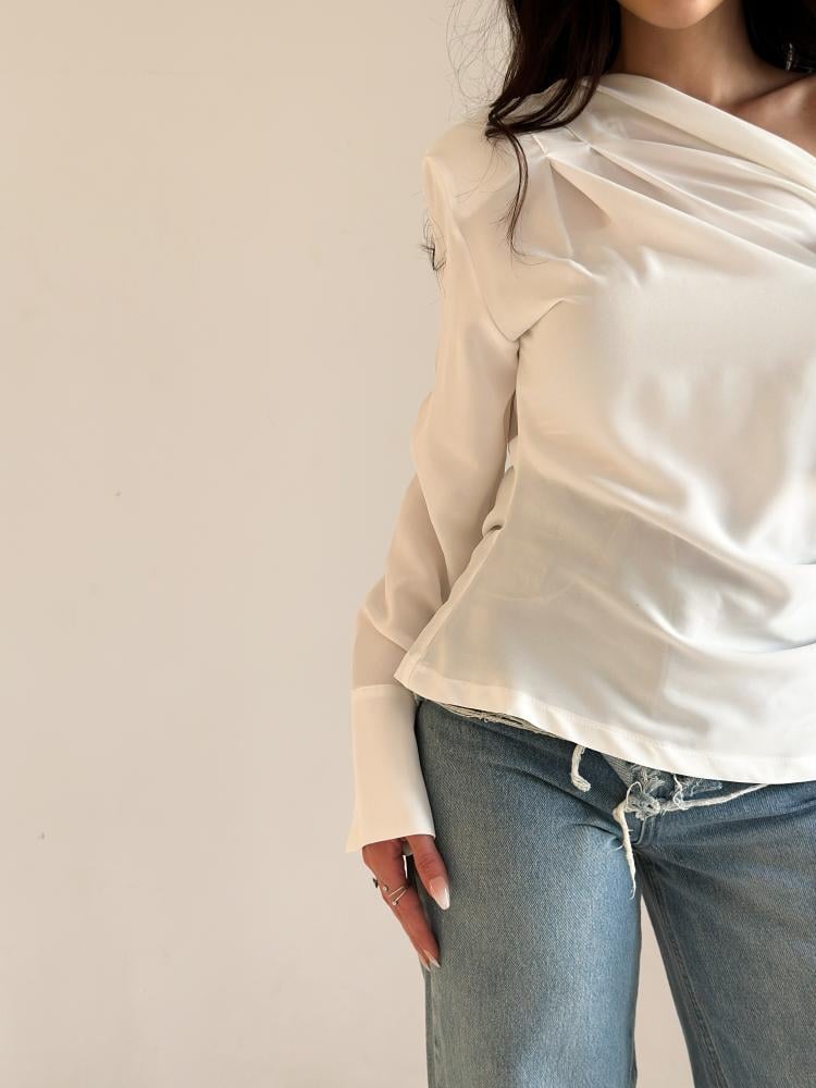 تميّزي بإطلالة جريئة وأنثوية مع هذه البلوزة البيضاء المصممة بكتف واحد، تجمع بين البساطة واللمسة العصرية. قصة غير متماثلة تضيف لمسة ملفتة، وقماش ناعم يمنحك الراحة طوال اليوم.
