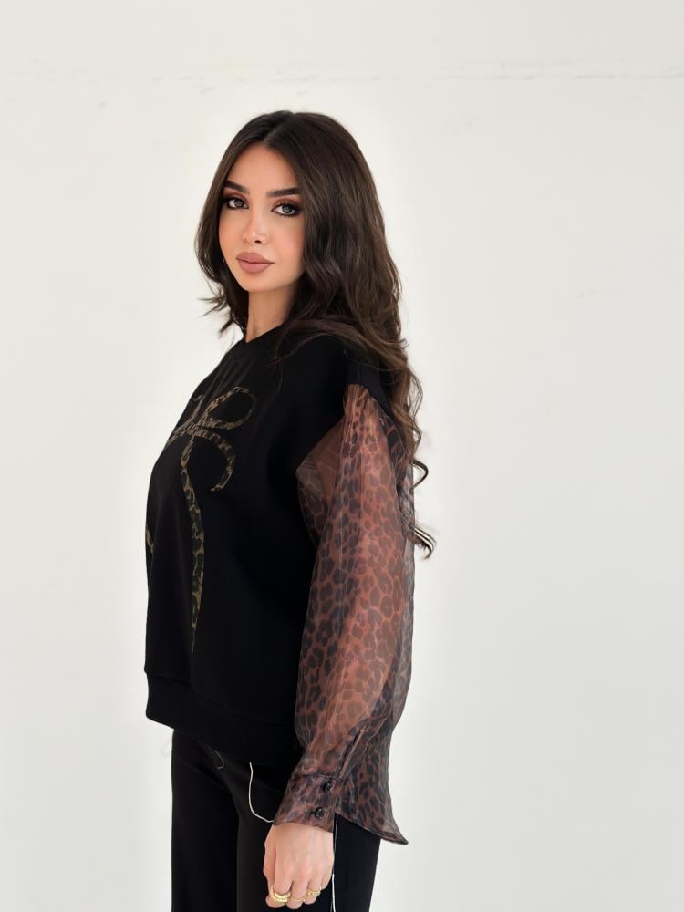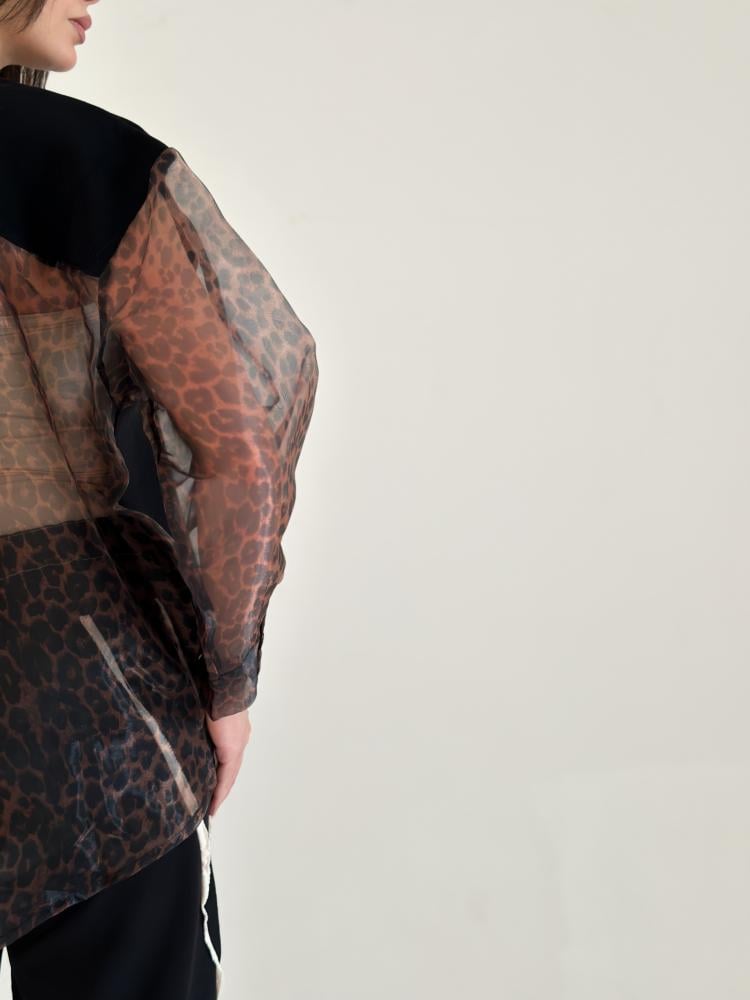 بلوزة رسمية وكاجوال في نفس الوقت، تجمع بين العملية والأناقة. صُممت بأكمام وخلفية شفافة من قماش الأورجانزا الفاخر بنقشة تايقر تضيف لمسة جريئة وراقية. مثالية للإطلالات اليومية أو المناسبات البسيطة، وتُنسّق بسهولة مع جينز أو بنطال كلاسيك.