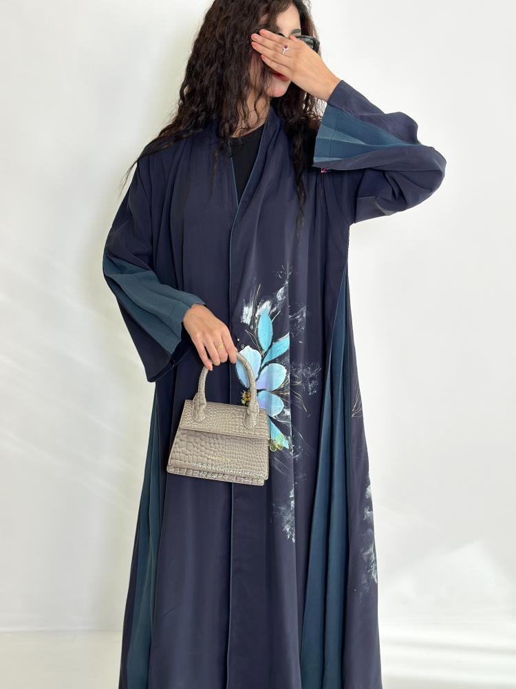 اختاري عباية تعبّر عن ذوقك المتفرّد بامتياز مع هذه القطعة الفاخرة المصنوعة من قماش الشمواه الناعم بلونه التركوازي الغامق الفريد. التصميم مزدان بنقشة فنية لزهرة باللون الأزرق الفاتح، تُضفي لمسة حيوية وأنيقة على الإطلالة.