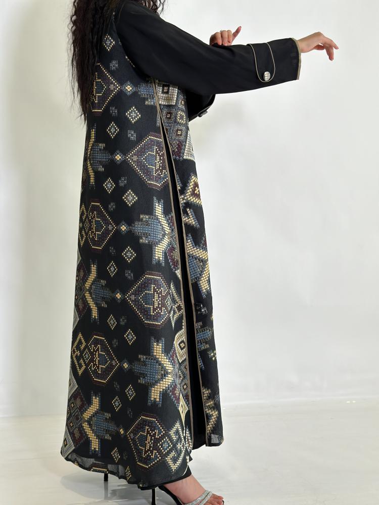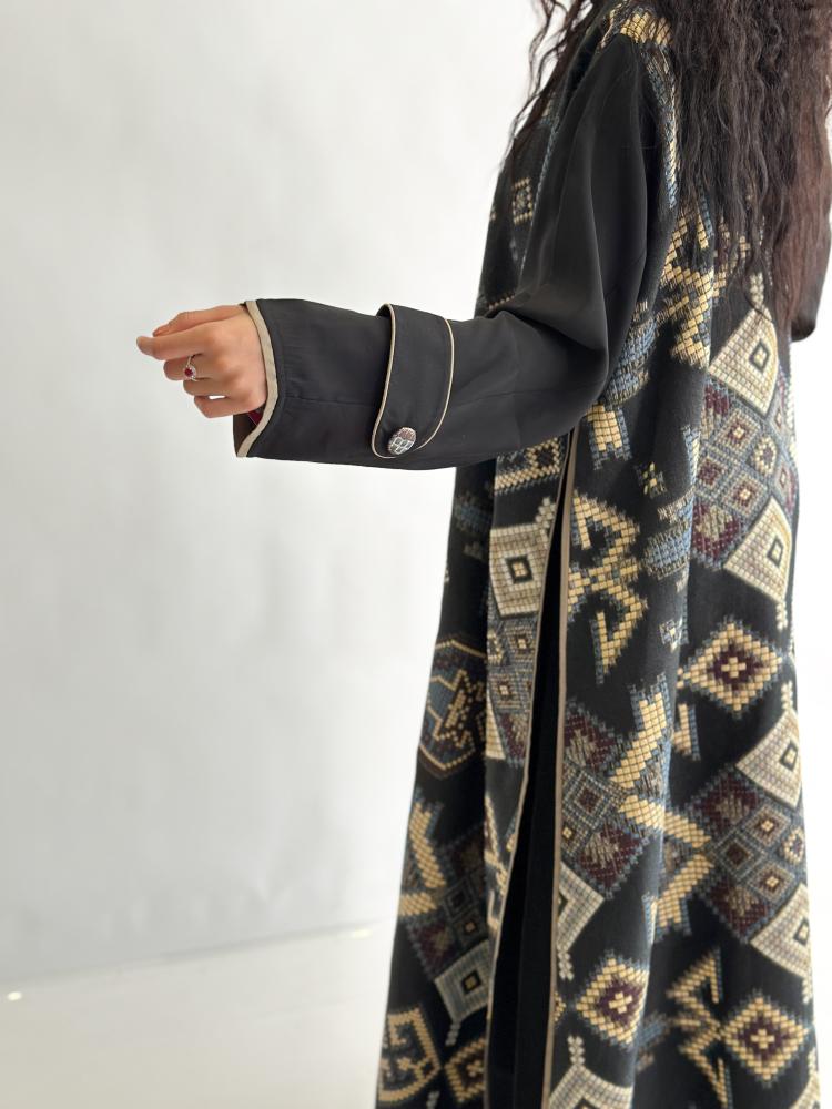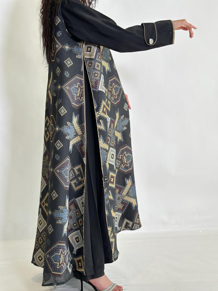 انطلقي بإطلالة تجمع بين الأصالة والحداثة مع هذه العباية الكلوش المصممة بقماش بنقشة هندسية مميزة تمتد على كامل الواجهة. دمج متناغم بين الألوان الهادئة والتفاصيل الدقيقة يمنحك مظهرًا فريدًا ولافتًا.